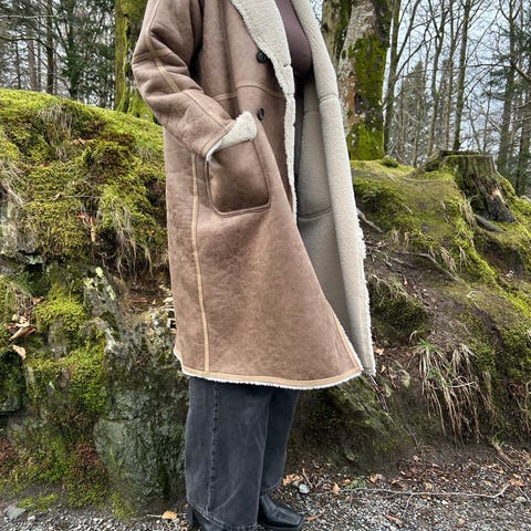 Semsket skinnjakke i brunt og grønt, foret innvendig. Bare brukt et par ganger. Vakkert plagg!