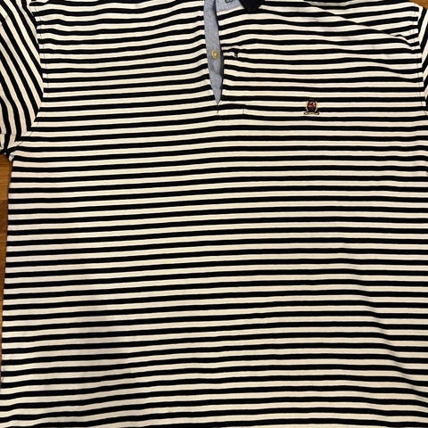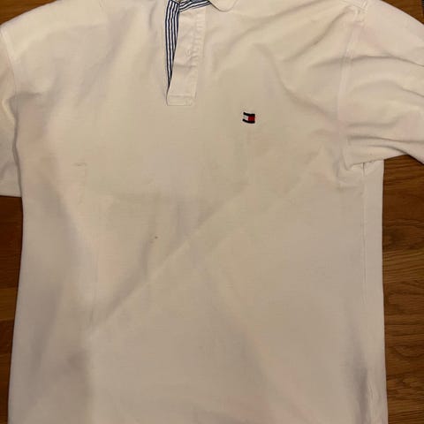 Tommy Hilfiger pique for herre i størrelse L. Piquen er grønn og laget av bomull. Klassisk modell med krage, kort knappestolpe og liten Tommy Hilfiger-logo på brystet. Passer til hverdagsbruk og enkel, penere bekledning. Veldig lite revnet rett over merkelappen som ikke synes når den brukes.