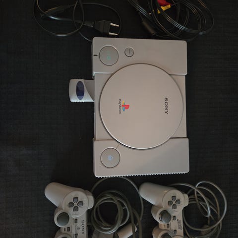 Sony Playstation spillkonsoll i grå farge. Konsollen leveres med to håndkontrollere og tilhørende kabler for strøm og tilkobling til TV. Egnet for avspilling av Playstation-spill og bruk med kompatibelt tilbehør.