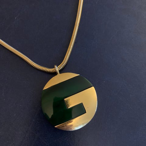 Dette er en Miu Miu skinnbrosje med heraldisk våpenskjold – ofte omtalt som: