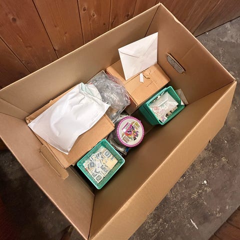 Blandet parti frimerker i esker. Frimerkene ligger hovedsakelig på papirbiter/utklipp. Ulike motiver og farger, både enkeltmerker og små grupper. Egner seg for sortering, gjennomgang og eventuell videre samling eller hobbybruk.