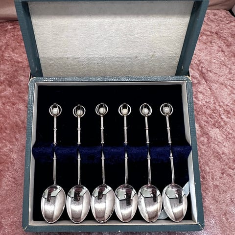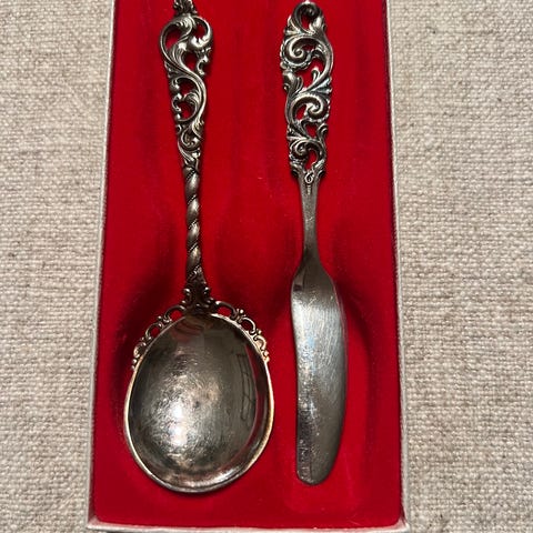 Syltetøyskje og smørkniv fra japanske Ando Cloisonne Company (Ando Shippo-ten). En kjent produsent av japansk emaljekunst. Ligger i orginalboks, kan ikke huske at det noen gang har blitt brukt.
