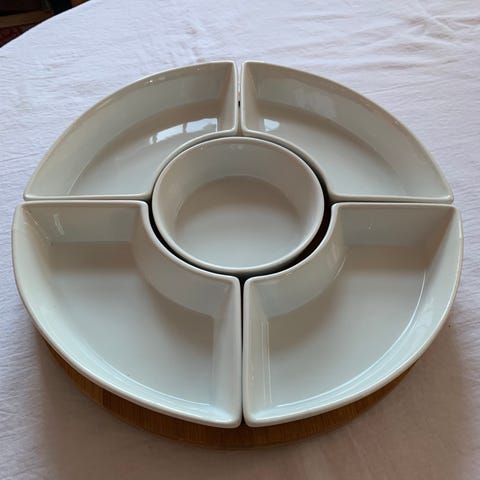Serveringsfat med flere skåler i hvit keramikk og rundt brett i bambus. Består av fire buede skåler som danner en sirkel, samt en rund skål i midten. Skålene kan brukes til f.eks. taco, frukt, snacks, tapas, nøtter m.m. Bambusbrettet fungerer som base for skålene og kan også brukes separat som serveringsbrett. Brettet har roterende base og kan snurres så man slipper å strekke seg etter maten.