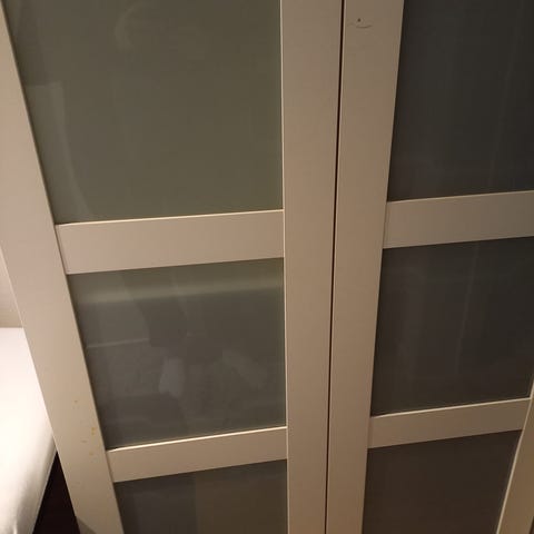 Den står nå delvis demontert og kan fraktes med varebil eller lignende. De to siste bildene viser hvordan garderoben ser ut nå. Den har få deler og er enkel å montere på ny.