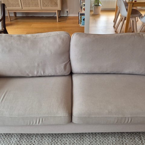 3 seters i fargen Tallmyra som er lysegrå. Den har to skjulte flekker, ikke prøvd å vasket bort. Flekkene er på hver side under ryggputene, se bildene i annonsen.