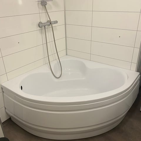 Hjørnebadekar med frontpanel selges.