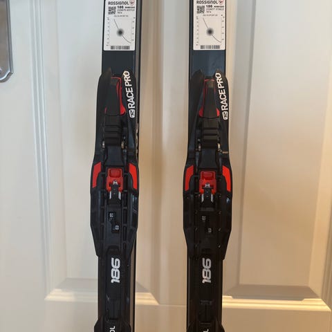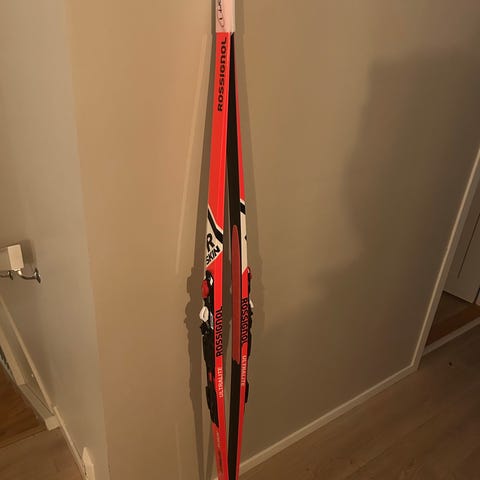 Som ny, minus 2-3 mindre riper. Brukt 3-4 ganger, selges grunnet overgang til felleski. Står at de ska passe vekt 95-105kg, men testa på XXL og de hadde ikke så mye spenn. Veier 86kg, og skiene passa bra. Raske og stabile ski. Nypris litt over 3500,-