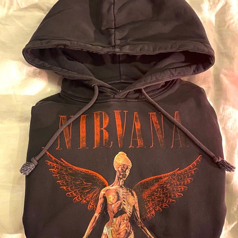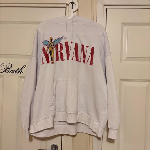 Pent brukt hvit Nirvana hettegenser med merke i front og på rygg. Str XS. Legger ved en grå Nirvana genser str XS med på kjøpet