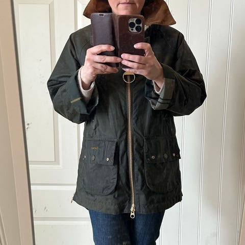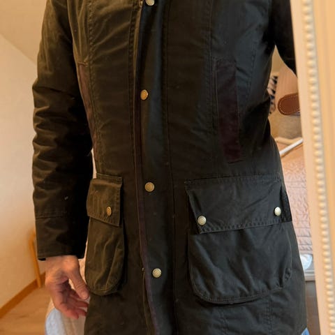 Veldig pent brukt Barbour oilskin jakke i størrelse 36/small, farge blå. Det følger også med avtagbar hette som så og si er ubrukt. Den mangler en plastbit på enden av strikken (se bilde).