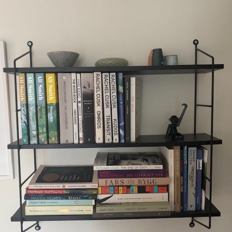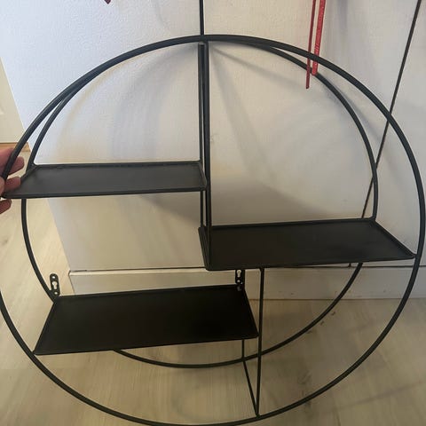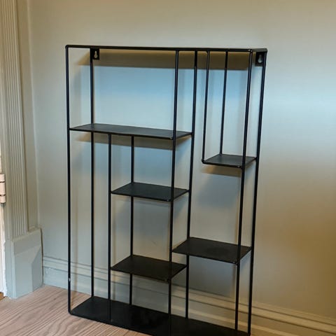 Svart vegghylle i metall, har noen merker