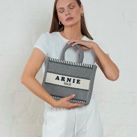 Arnie Says stoffveske for dame i beige tekstilmateriale. Vesken har to bærehåndtak og åpent hovedrom med enkel lukking øverst. Forsiden er dekorert med Arnie Says-logo og teksten «Oslo». Passer til hverdagsbruk, shopping eller som ekstra bag til skole og jobb.