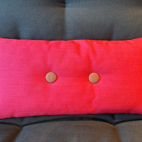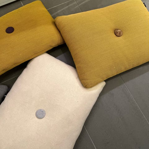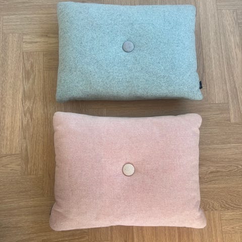 Hay dot puter. Rektangulære pynteputer med knappdetalj i midten. Én i mørk grå farge og én i lys mint farge. Tekstiltrekk i ull. Ulik farge på knappene på hver side. 60x45 cm. Pris er per stk.