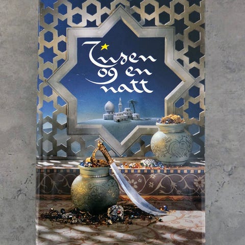 Eventyrboka Tusen og én natt. En eventyrsamlingen med blant annet fortellingene om Aladdin, Ali Baba og Sinbad sjøfareren. Innbundet bok med illustrert omslag. Utgitt på Kagge Forlag.