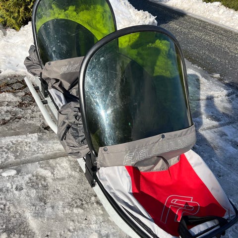 Fjellpulken/Barnepulk med vindskjerm, sele og drag.
