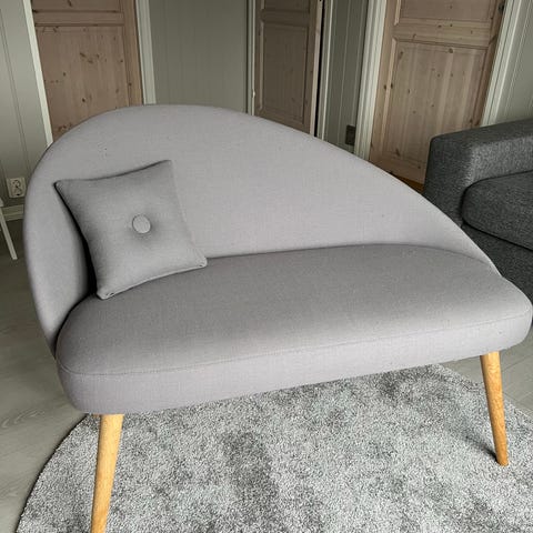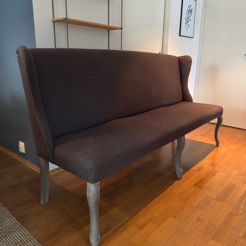 Benke-/spisestuesofa i grått tekstiltrekk med ben i lyst tre. Sofaen har avrundet rygg og sete, og smale, skråstilte ben som gir et lett uttrykk. Passer for bruk ved spisebord, i kjøkkenkrok eller som ekstra sitteplass i stue eller gang. Benken har en høyde på 77 cm. Bredden på ryggstøtten er 100 cm , og bredden på setet nederst er 118 cm.
