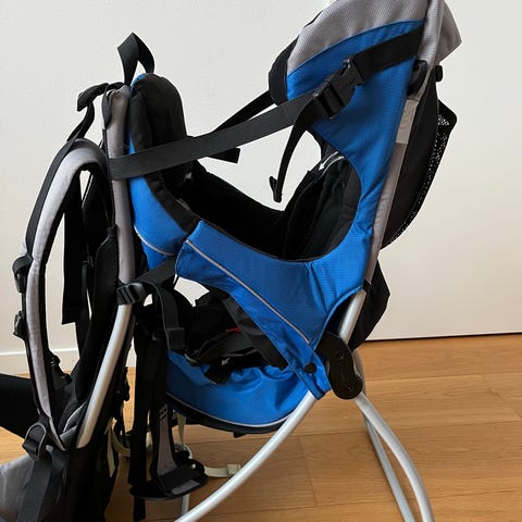 Barnestolen har seler for sikring av barnet og polstret rygg og sidestøtte for økt komfort. Metallramme med integrert støttebøyle gjør at bæremeisen kan stå stabilt på gulvet ved inn- og utstigning.