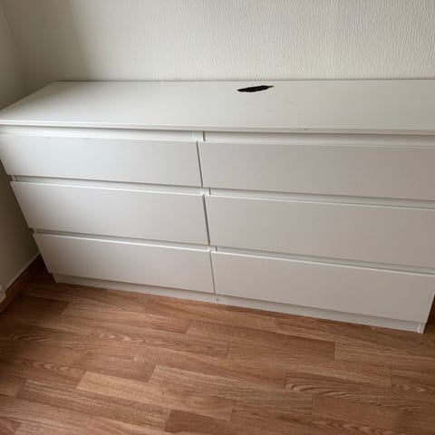 Kommoden fremstår som nesten ny, uten synlige skader eller slitasje. Den har fire romslige skuffer med lettløpende skinner og gir god oppbevaringsplass til klær, sengetøy eller annet.