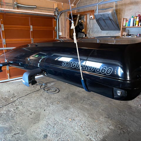 Takboksen er i utgangspunktet pent brukt, bortsett fra at den er oppskrapt fra tak i parkeringshus. Bøyler følger ikke med, og foreløpig har jeg ikke funnet nøkkelen.