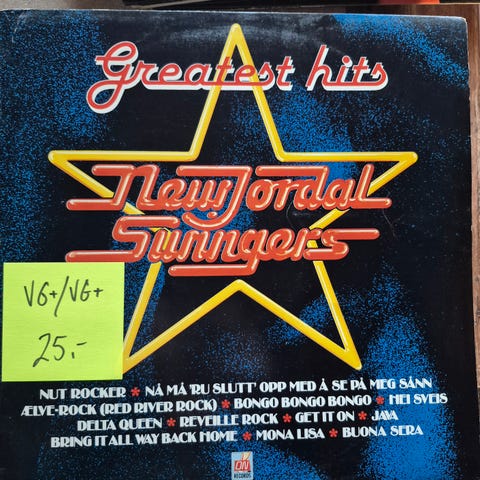 New Jordal Swingers Greatest Hits 2 LP plate. Vinylalbum med samleutgivelse fra New Jordal Swingers, med flere av bandets kjente låter samlet på én plate. Standard 12" LP-format egnet for avspilling på platespiller med 33 1/3 rpm. Omslag med illustrert coverdesign og trykt låtliste på forsiden.