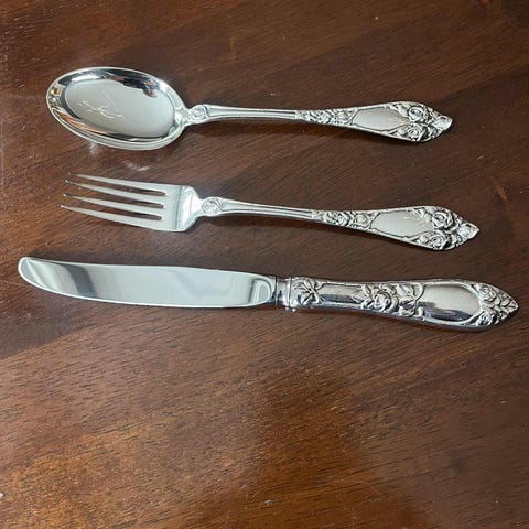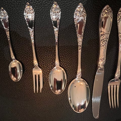 Sølvbestikk i Opphøyd Rose til 12 personer.