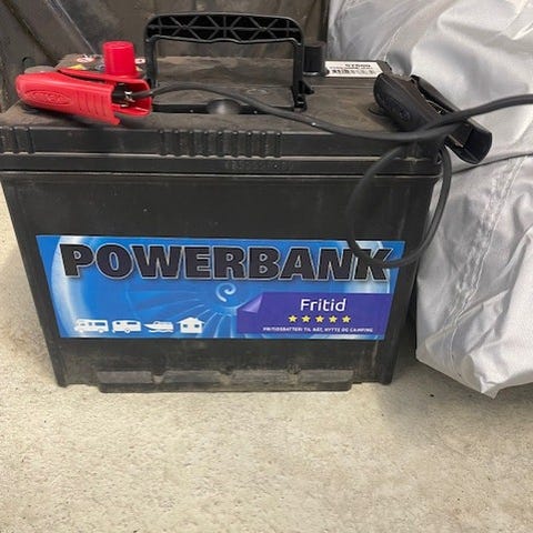 Biltema batteri på 12V og 90AH. Lyser grønt og fungerte helt fint sist gang det ble brukt. Usikker på hvor gammelt det er.