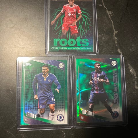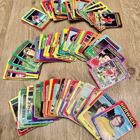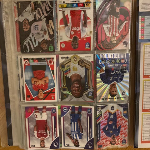 Samling med ulike fotballkort i forskjellige design og farger. Kortene viser spillere, lagbilder og ulike fotballmotiver. Egner seg for samlere av fotballkort eller som tillegg til eksisterende samlinger. Antall og eksakte utgaver fremgår av bildene.
