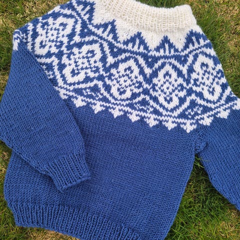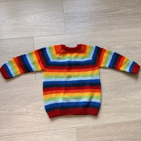 Hjemmestrikket genser rundt str 1 år, pluss/minus. Ikke brukt, mangler knapp bak som ikke er sydd på.