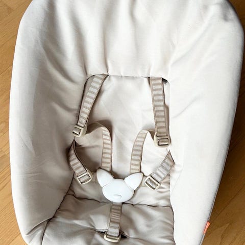 Stokke Tripp Trapp Newborn sete i beige tekstil. Settet består av et spedbarnssete som festes på Tripp Trapp-stolen for å kunne bruke stolen fra nyfødtstadiet. Bøyle til å henge leke i følger også med