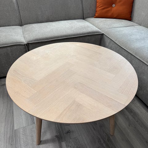 «Muran rundt sofabordsett Ø90 H45.5 Ø75 lakkert eikefiner brun med understell stål svart. Moderne sofabord hvor det ene bordet delvis kan skyves under det andre. Stilrent, tidløst, klassisk og moderne. Vil passe perfekt inn i ethvert hjem