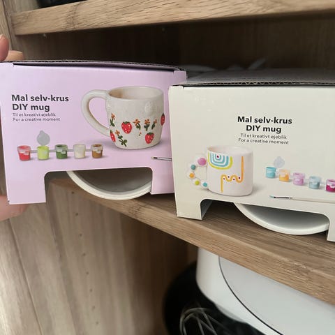 Mal ditt eget keramikkkrus. Hvit krus med maling og pensel. Settet inneholder et hvitt keramikkkrus, flere små bokser med maling i ulike farger og en pensel. Egnet til dekorering av eget krus til bruk i hverdag eller som hobbyprosjekt. Kruset har hank og nøytral overflate som kan males etter eget ønske.
