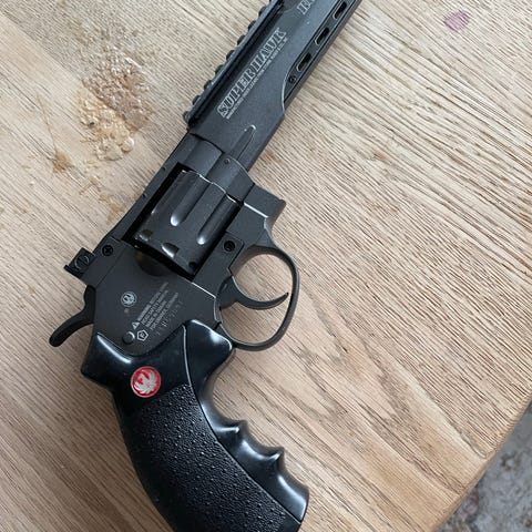 Selger en lite brukt luftpistol, SR. 357. Det følger 6 patroner med samt ammunisjon. Den er gassdrevet og gass patroner kjøpes separat. Kalibret er på 4.5mm.