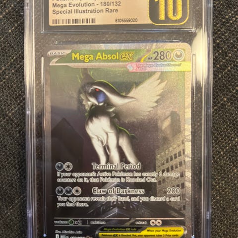 Pokémon Mega Absol EX samlekort, gradert PSA 10 GEM MT. Kortet er innkapslet i offisiell PSA-holder med etikett som viser årgang, kortnavn og serienummer. Dette er et Ultra Rare-kort med holografisk motiv av Mega Absol EX. Egner seg som samleobjekt for Pokémon-kortsamlere og til oppbevaring i beskyttende display eller samlemappesystem.