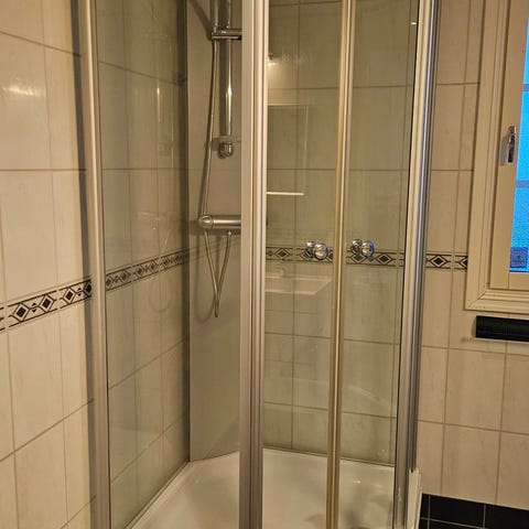 Dusjkabinett med skyvedører og dusjpanel klart glass