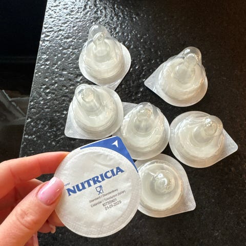 Pumpedeler som kun er brukt om lag 2 ganger, da traktene var feil størrelse for meg og vi foretrekker andre beholdere. Kjøpt fra Ammeklinikken. To komplette sett med pumpetrakt, vakuumventil, tilbakeslagsventil og slange. Størrelse 20 mm. To beholdere/flasker (ikke alle deler er avbildet). Vasket og sterilisert. Nypris 985,-
