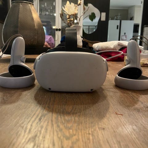 Selger en Oculus Quest 2 fordi at jeg ikke bruker den lenger. Jeg har kjøpt et nytt feste som går rundt hodet som man ser på bildene. Den har et batteri som gjør at man kan spille 7-8 ca i strekk