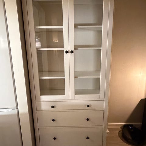 Hemnes vitrineskap i meget bra stand selges billig pga flytting, til bare 1950,- ny pris 3795,- kan kjøres for pris i tillegg