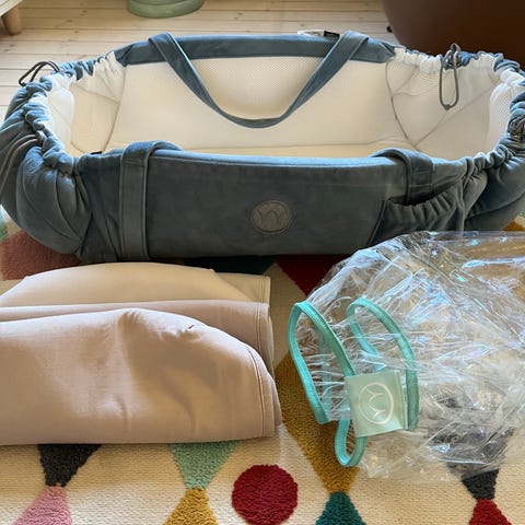Pent brukt kort tid til ett barn. Finnes ingen anmerknigner og slitasje. Kommer med madrass bekyttelse og vårpose. Kan bæres på skulderen.