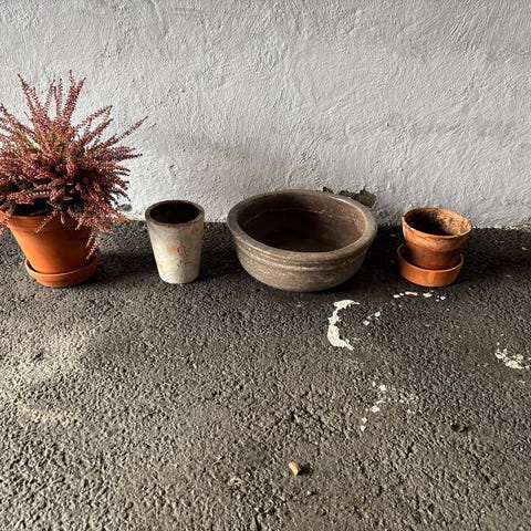 Selger 4 flotte og solide keramikkpotter i støvet rosa/gammelrosa nyanse med dekorativt relieffmønster og krakelert glasur.