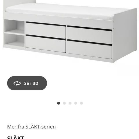 IKEA SLÄKT seng med oppbevaring i hvit utførelse. Sengen har liggemål 90x200 cm og er utstyrt med fire skuffer på siden samt åpne hyller i fotenden for ekstra oppbevaringsplass. Selges med madrass.