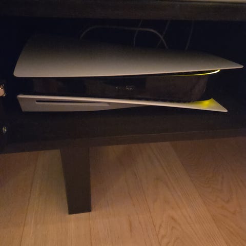 Bildene viser også to trådløse DualSense-kontrollere og et trådløst headset som kan brukes sammen med konsollen dersom de følger med i salget. PS5 har flere USB-porter, HDMI-utgang og nettverkstilkobling på baksiden for tilkobling til TV, strøm og internett.