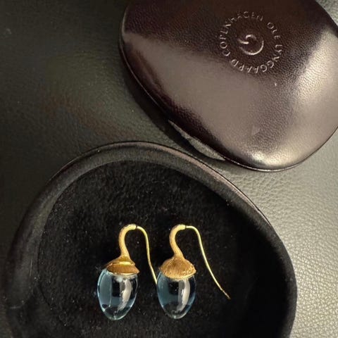 Øredobber, rødt gull, Ole Lynggaard. De vakreste øredobbene i 18 karat gull med blader av satengrødt gull som ligger oppå hverandre og dråpeformede Sky blue topas i enden.
