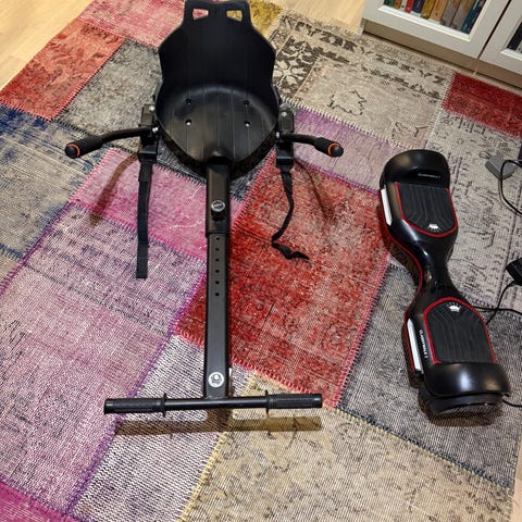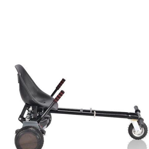Hoverkart gokart-sete til hoverboard i svart plast med metallramme. Setet har justerbar lengde på rammen for å passe ulike brukere, håndtak på hver side for styring og fotstøtter foran. Festes til et hoverboard med stropper (medfølgende på bildet). Egnet for brukere som ønsker å gjøre et vanlig hoverboard om til en sitte-gokart-løsning.