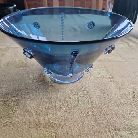 Sett med blå glassboller og skåler i ulike fasonger. Produktene er laget i gjennomfarget blått glass, med både glatte og strukturerte overflater. Egner seg som serveringsboller, fruktskåler eller dekorative objekter i interiøret. Flere størrelser og former gir mulighet for variert bruk og plassering.