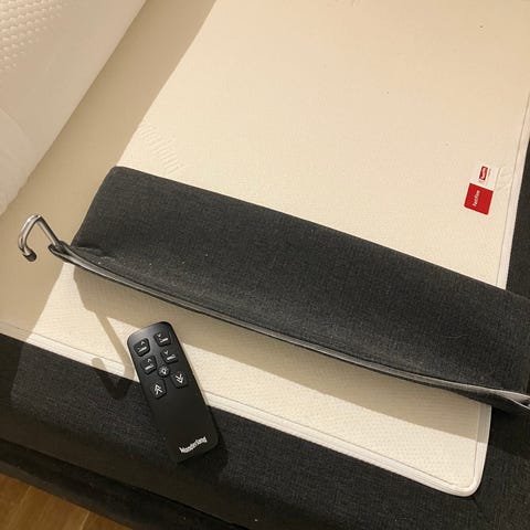 Selger en XOV S3 Smartseng 90x200 cm i tekstil Gandar 16 Grå med 8 cm overmadrass og sortbeiset ben med oppbevaringsrom. Kjøpt på Skeidar. Stått på hytta i 3 år og veldig lite brukt. Er demontert for enklere frakt. Følger med original overmadrass.