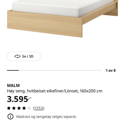 IKEA Malm seng i hvitbeiset eikefiner. Sengen har en enkel og rettlinjet ramme i finert treverk. Under sengen er det åpen plass som kan utnyttes til oppbevaring med separate skuffer eller bokser.
