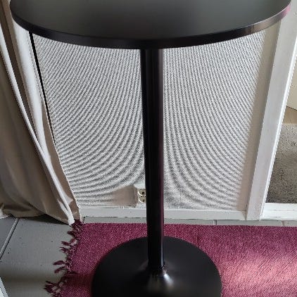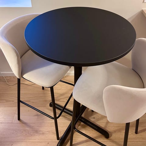Rund barbord med to barkrakker svart bordplate hvite seter treben