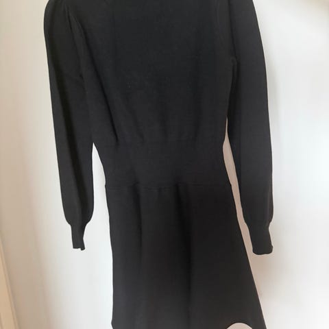 Kjolen er svart med småmønstret trykk og er laget i viskose. Modellen har lange ermer, rynkedetaljer øverst og utsvingt skjørtedel. Passer som hverdagskjole eller til litt pynta anledninger. Rekker til litt over knærne