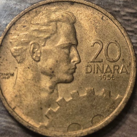 Motiv: Forsiden viser en person med kornaks, og baksiden viser det sosialistiske Jugoslavias våpenskjold.
