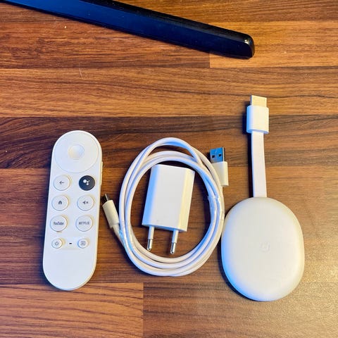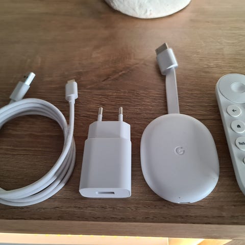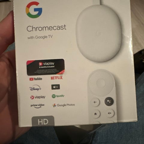 Google Chromecast Hd med Google TV med fjernkontroll hvit med beskyttelse. i bra stand,har alltid hatt beskyttelse på fjernkontrollen, lite brukt da jeg fikk tv med innebygd chroomecast så den har ligget i en skuffe mesteparten av tiden.