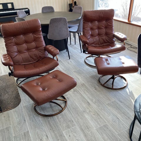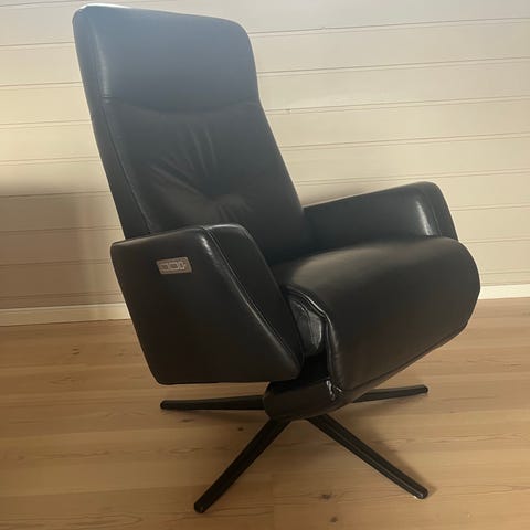 Pent brukt lenestol med krakk selges til halv pris.